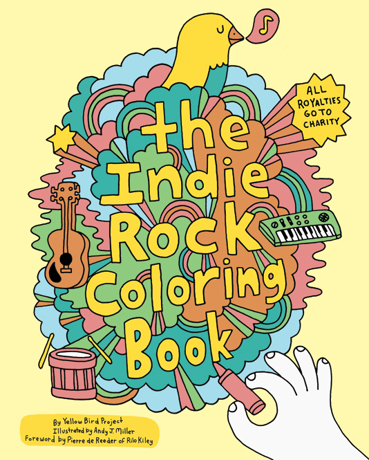 Pero hace un rato navegando, encontré el muy peculiar «the Indie Rock Coloring Book», este proyecto fue creado por «Yellow Bird Proyect» una asociación benéfica de Montreal, que tiene como principal tarea es crear playeras con colaboraciones de músicos del «indie rock» para distintas caridades elegidas por estos.