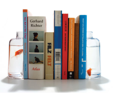 - Halve Bookends es un frasco partido a la mitad que bien puede servir de pecera como en el ejemplo o bien puede ser un adorable florero. Lo consiguen aquí
