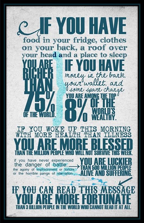 If you have food in your fridge… Publicado el febrero 11, 2011 por Mis suéteres feos Hoy navegando en internet encontré esta imagen, desconozco al autor (si alguien lo sabe, por favor). Que me hizo recordar lo afortunada soy. Además de tener un gran manejo tipográfico Comparte esto: Haz clic para compartir en X (Se abre en una ventana nueva) X Haz clic para compartir en Facebook (Se abre en una ventana nueva) Facebook Haz clic para compartir en Pinterest (Se abre en una ventana nueva) Pinterest Me gusta Cargando... Relacionado