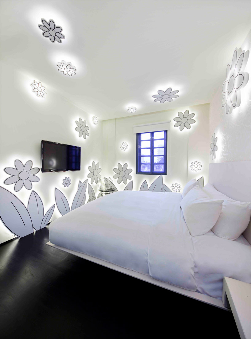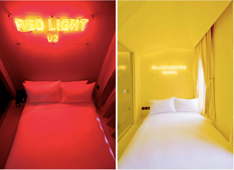 En uno de los pisos el tema es el color y la música, con habitaciones con nombres de canciones populares con Pink Triangule de Weezer, Red Light de U2 o Yellow Submarine de los Beatles. En otro nivel el color es blanco con algunos detalles en color.