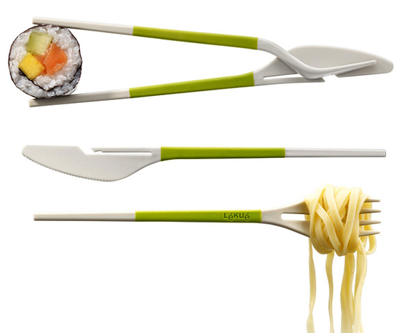 La fusión occidental y oriental en estos cubiertos de Lékué que encajados forman unos palitos faciles de manejar o puender tenedor y cuchillo. ¡Genial!