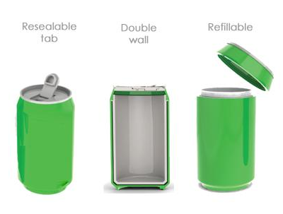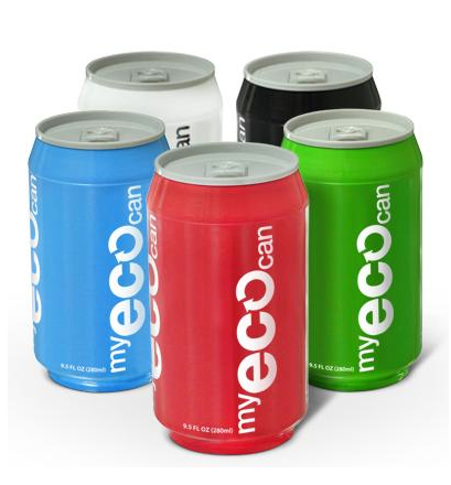 Para los que prefieren sus bebidas en lata ECO Drinking Can, que es reutilizable esta hecha de PLA (Poly-Lactic Acid) el beneficio de este material es que se puede componer en inofensivos los compuestos naturales de vuelta a la tierra. Tiene doble pared lo que lo hace térmico.