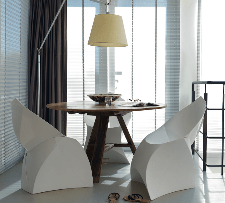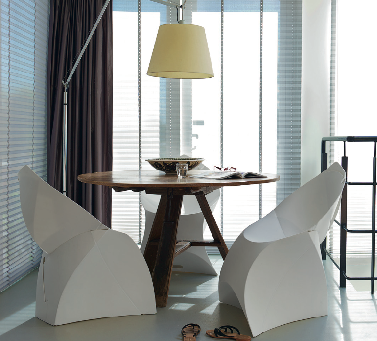 En 2009 Tom Schouten diseñador industrial fundo Flux que viene de «flexible and Luxury» y lo lograron con esta hermosa silla ideal para interiores y exteriores, pesa tan solo 4.3 kg., pero soporta 160kg., se puede reciclar y esta hecha en Holanda.