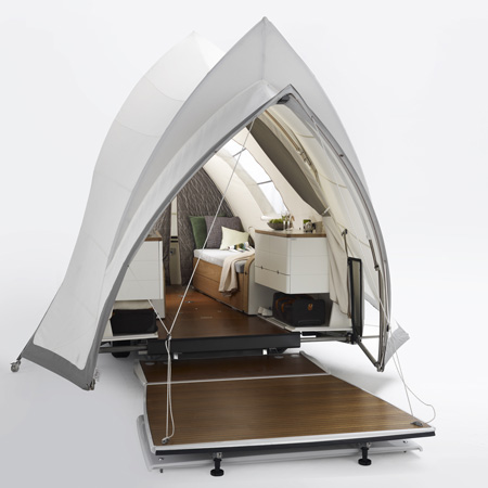 El arquitecto belga Axel Enthovendiseño esta casa rodante inspirada en la casa de la ópera en Sydney de Jørn Utzon, a la que bautizo como Ópera, esta hecha de lona se despliega sobe un remolque e incluye dos camas, un baño, agua fría y caliente e iluminación LED.