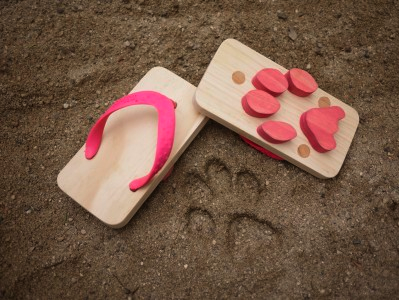 En honor a la tradición Japonesa Ashiato de Kiko kids son unas sandalias rectangulares de madera que imprimen la huella de un animal en la arena, me pregunto porque no las hacen en 26.